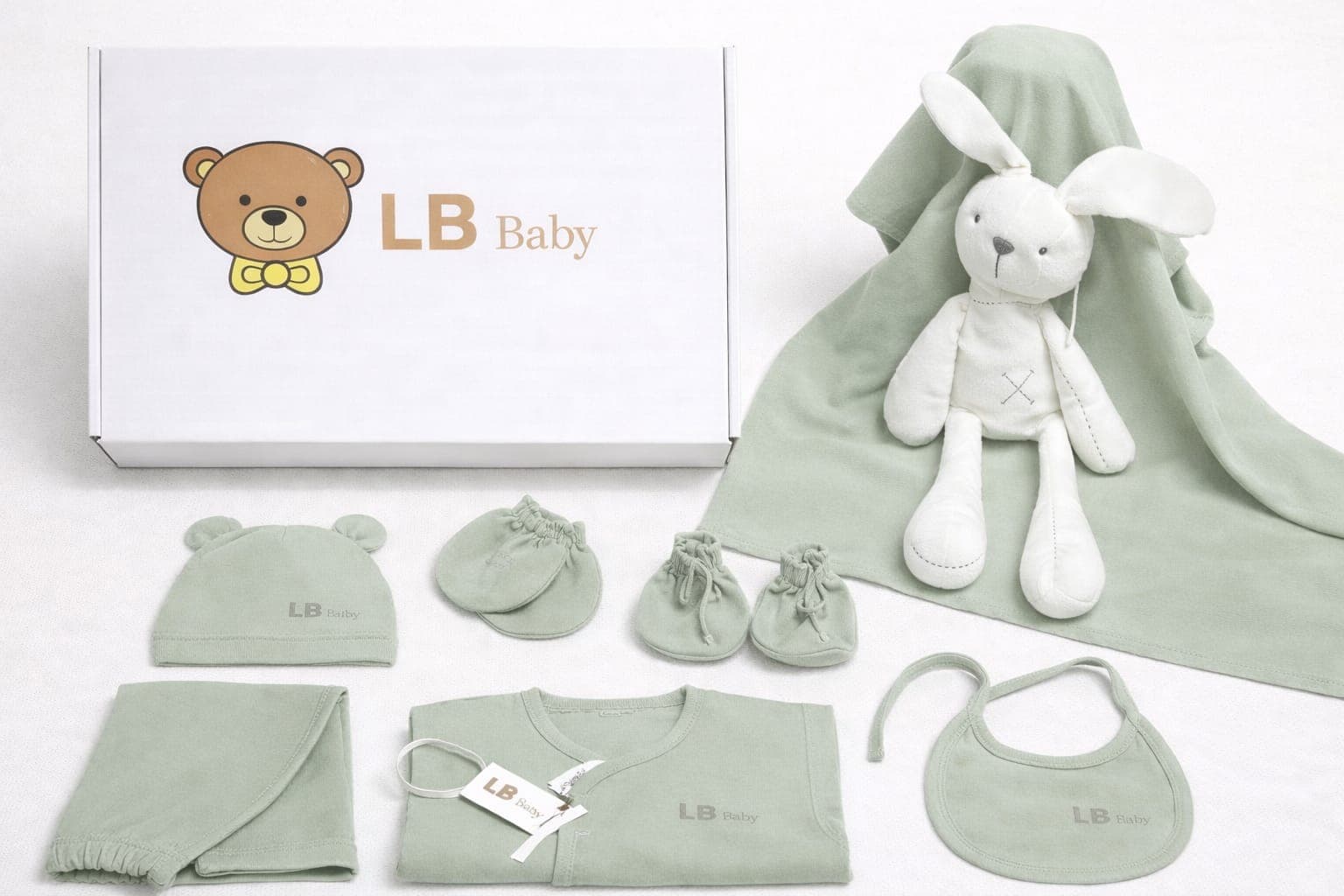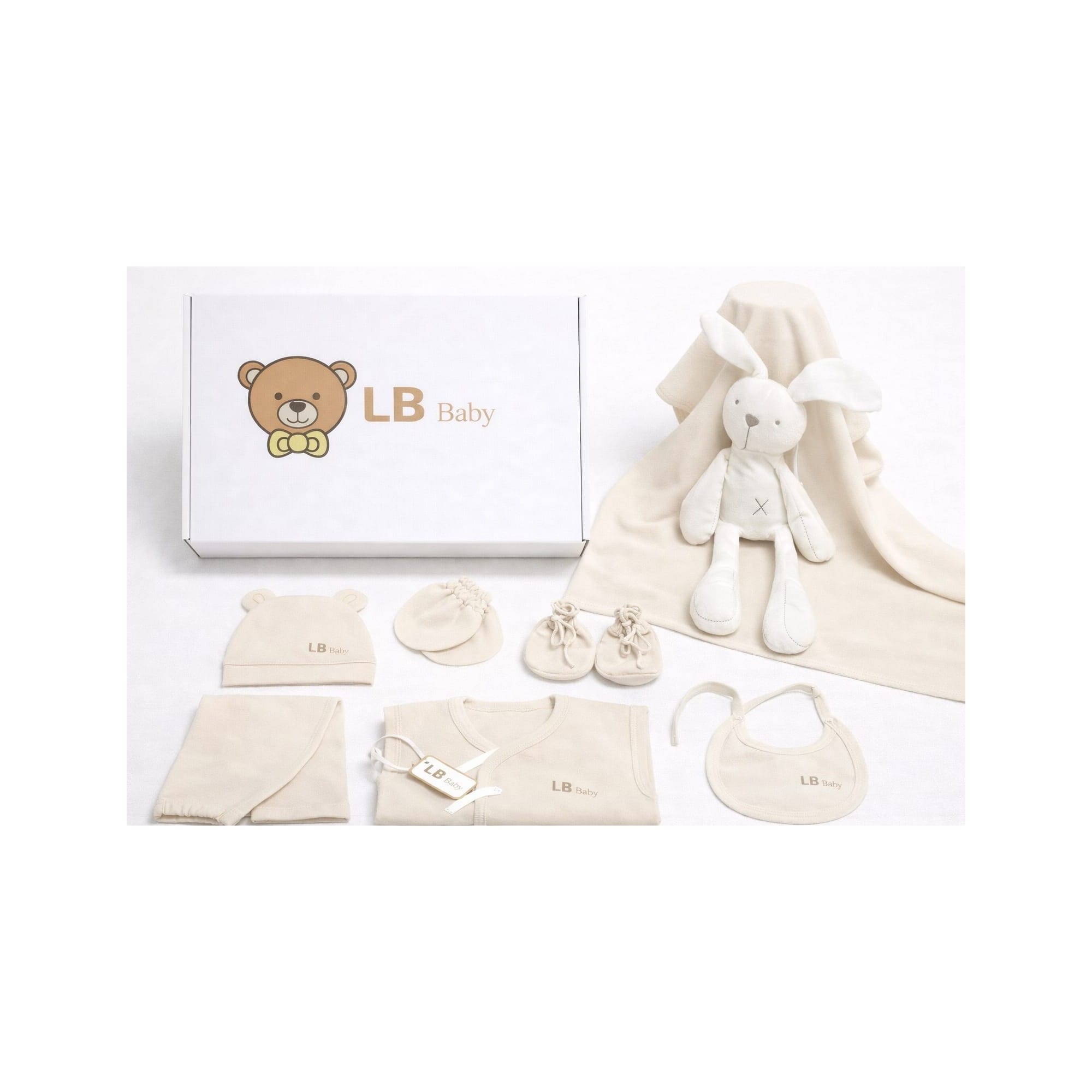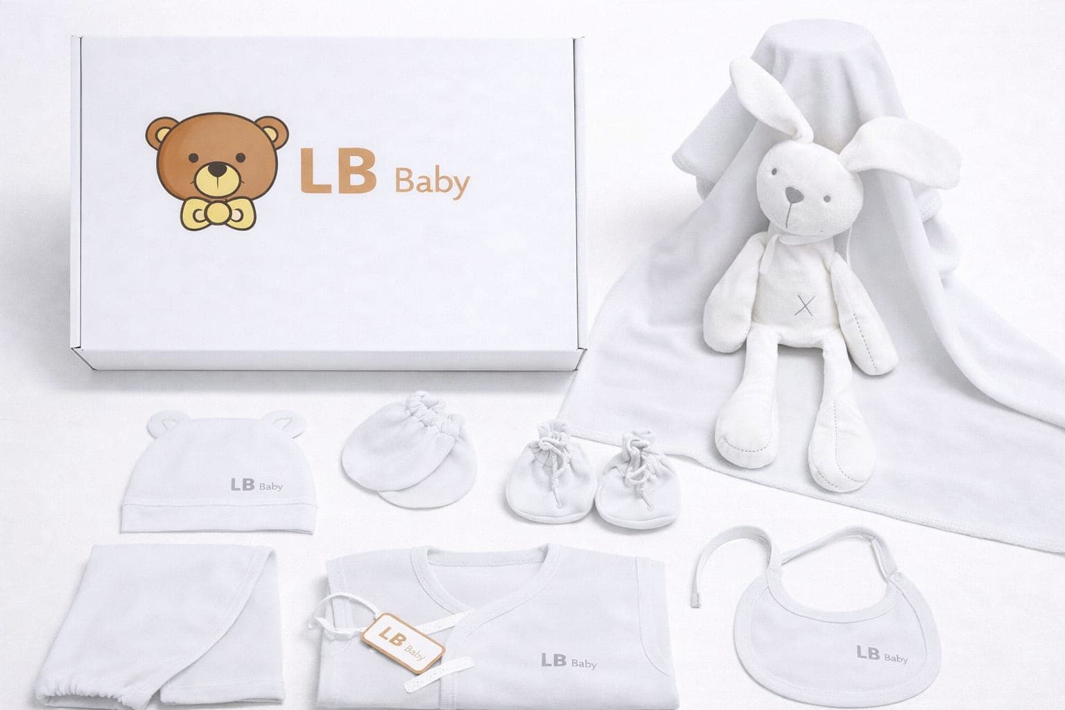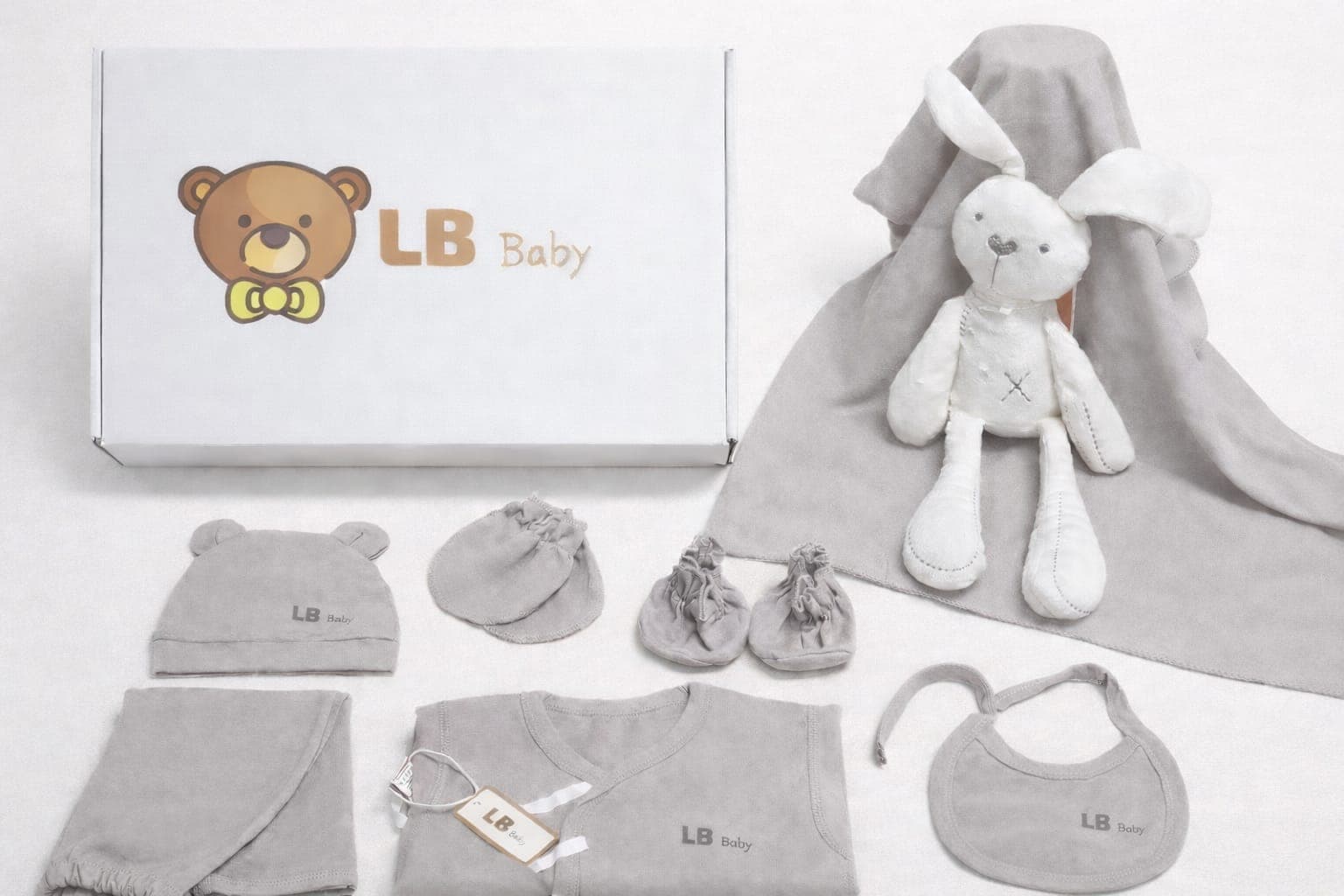 Set de nacimiento en tonos neutros, perfecto para los primeros días del bebé.